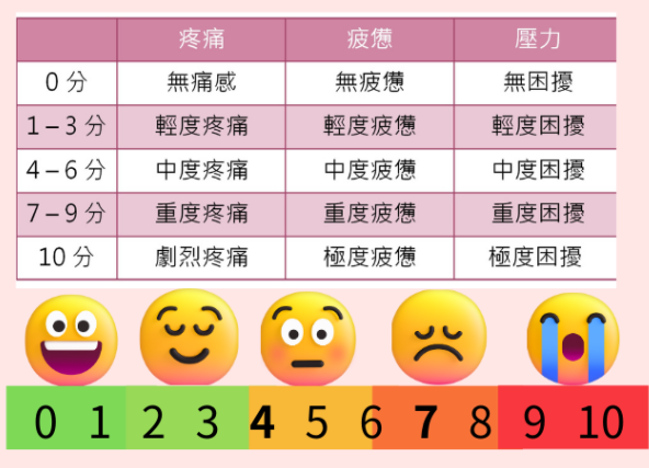量尺可協助提供醫護人員了解自身疼痛、疲憊及心理健康狀況,以利醫護團隊根據變化即時調整照護方案,從而提升您的生活品質和治療效果。