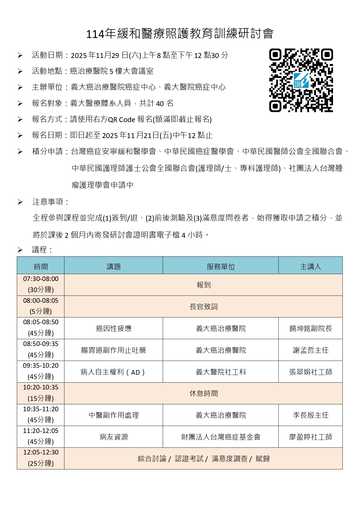 研討會名稱 活動日期 課程表 活動地點 主講人 主辦單位 報名網址 聯絡人 聯絡電話 本會認定積分 緩和醫療照護教育訓練研討會 2025/11/29 20251129緩和醫療照護教育訓練研討會海報 義大癌治療醫院5樓大會議室(地址:高雄市燕巢區角宿里義大路21號) 義大癌治療醫院饒坤銘癌症醫療副院長等人 義大醫療財團法人義大癌治療醫院癌症中心 https://forms.gle/SGH2XyKRnrCzSR6Q8 戴乃淨 (07)615-0022#5948 2 keyboard_return
